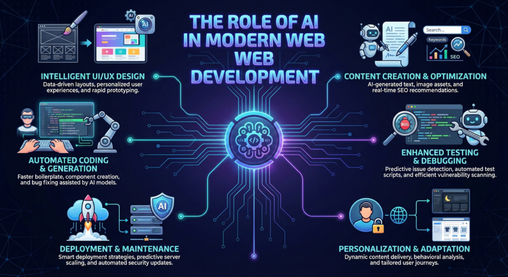 Artificial Intelligence (AI) has rapidly evolved from a futuristic concept into a practical, transformative force across industries. In web development, AI is no longer optional—it has become a core component of how modern websites are designed, built, optimized, and maintained. As businesses compete in an increasingly digital world, AI is enabling developers and organizations to create smarter, faster, and more personalized web experiences.